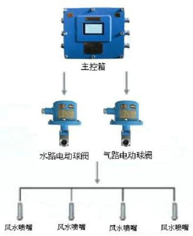 當(dāng)傳感器探測到控制信號時,信號送入主控箱,主控箱先后控制高壓風(fēng)閥、高壓水閥開啟,將高壓風(fēng)、高壓水輸送到風(fēng)水噴頭(即氣水噴頭)進(jìn)行噴霧降塵(風(fēng)水噴頭可對風(fēng)水壓力大小進(jìn)行調(diào)整),噴霧工作至延時時間(延時可調(diào))停止噴霧降塵;當(dāng)信號再次觸發(fā)時,進(jìn)行下一個工作循環(huán)過程。
